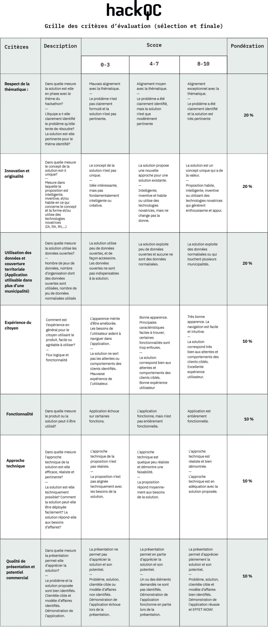 La grille des critères d’évaluation est utilisée par le jury pour choisir les gagnants. Elle est également utilisée par les mentors pour accompagner les équipes et pour la sélection des finalistes.